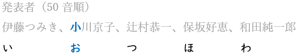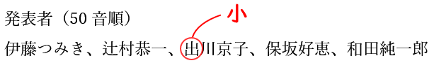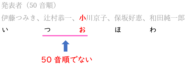 「発表者(50音順)」とあるので、『出川(でがわ)』→『小川(おがわ)』への変更により、50音順に並びかえる必要があります。