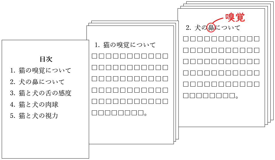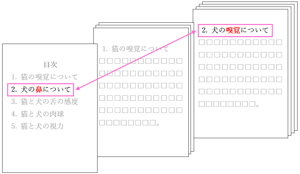 どのタイミングで目次と本文を確認するか、また目次の内容が本文のどこと対応しているかを事前に把握しておく必要があります。目次と対応する箇所に赤字が入ったら、目次にも赤字が入っているか確認する癖をつけておきましょう。
