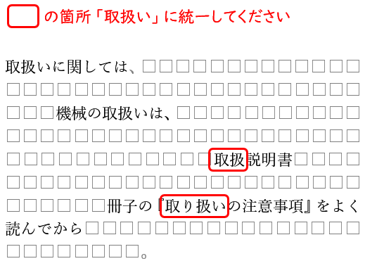 以下の例では一つの言葉が3つの表記に揺れています。「取扱い」「取扱」「取り扱い」の3つです。