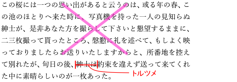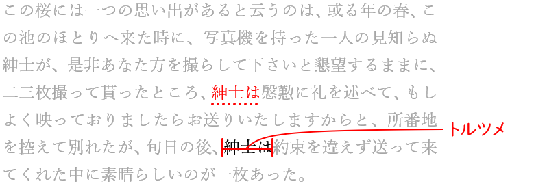 上のゲラを見てもわかりますが、下記のように、本来トルツメとすべき「紳士は」の文字のすぐ上にある「紳士は」が誤って削除されています。