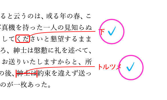 原稿のチェック(✔)の印は、オペレータが修正をしたというチェックです。校正者も確認をした印としてチェックを入れるように、オペレータも修正をした箇所には何らかのチェックを入れます。