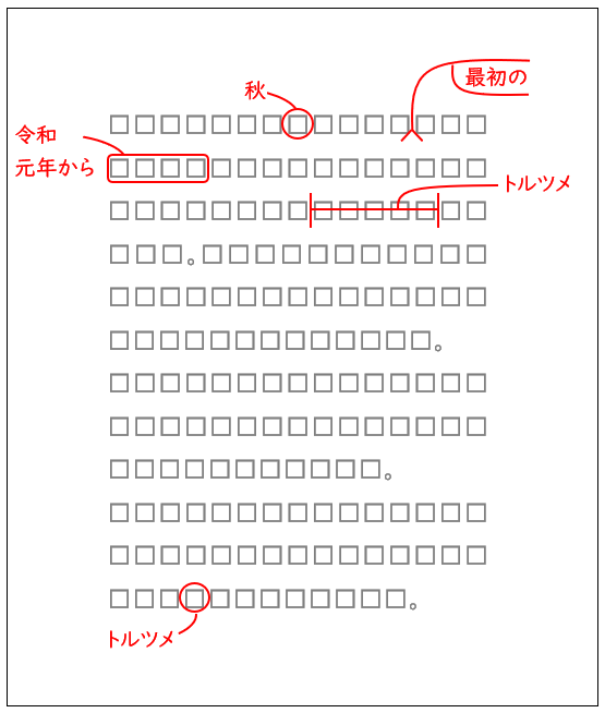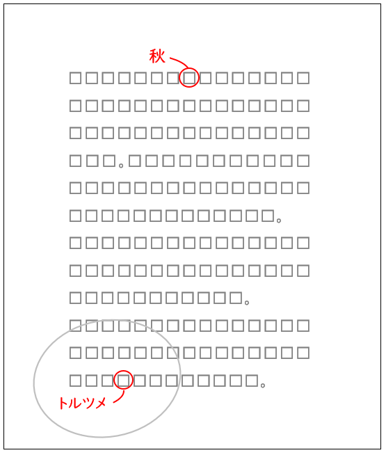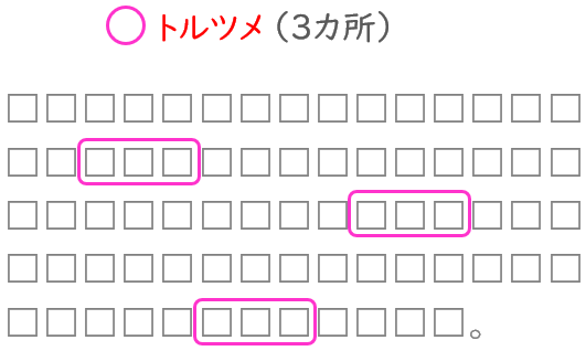 この場合、修正する側は目線が上に行くので、上部の赤字にだけ意識が行ってしまい、下の「トルツメ」の指示を見落とす可能性があります。