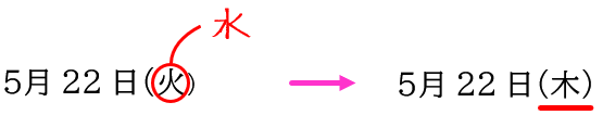 曜日の赤字では、「水」と「木」、「日」と「月」が見間違いの多いものになります。特に文字が小さかったり、乱れていたりするとさらに見分けがつきにくくなります。