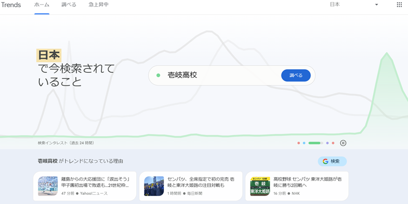 特定のトピックの人気度や検索傾向を知りたい場合には、「Google Trends」が役立ちます。