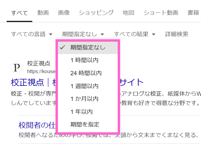 プルダウン内に表示されている時間や期間を指定して検索することができます。最新のニュース記事を知りたい場合や、過去の情報を探している場合に役立ちます。また、一番下の「期間を指定」からは任意の期間を指定することができます。