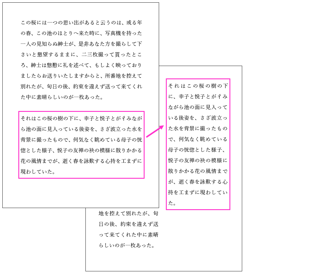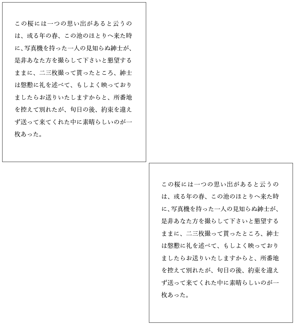 続いてイラストと同様に、文章でも「斜め」「上下」「左右」の位置で見ていきます。文章の内容は同じなので、比較のしやすさだけを意識して3つを比べてみてください。