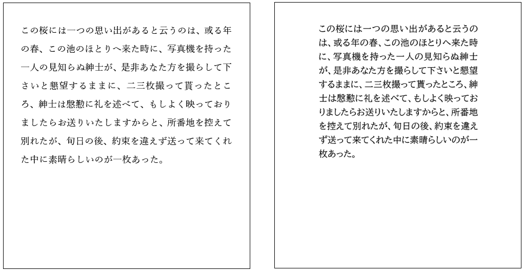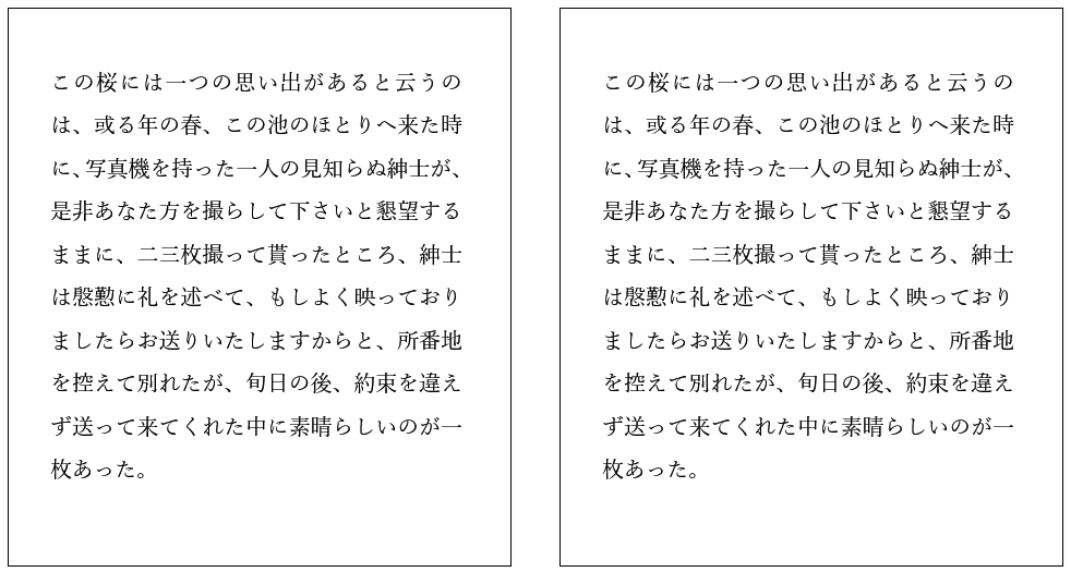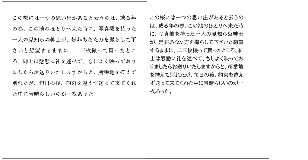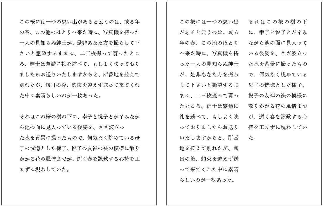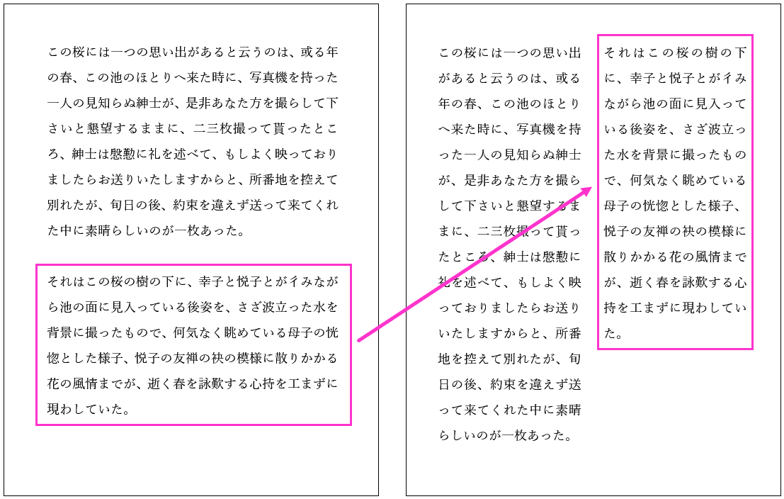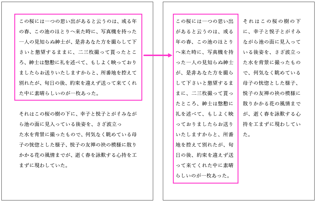 左は一段組みの「原稿」です。これを二段組みに変えて仕上げたものが右の「ゲラ」になります。レイアウトが変わるので、これまでの例とは少し見方が違ってきます。