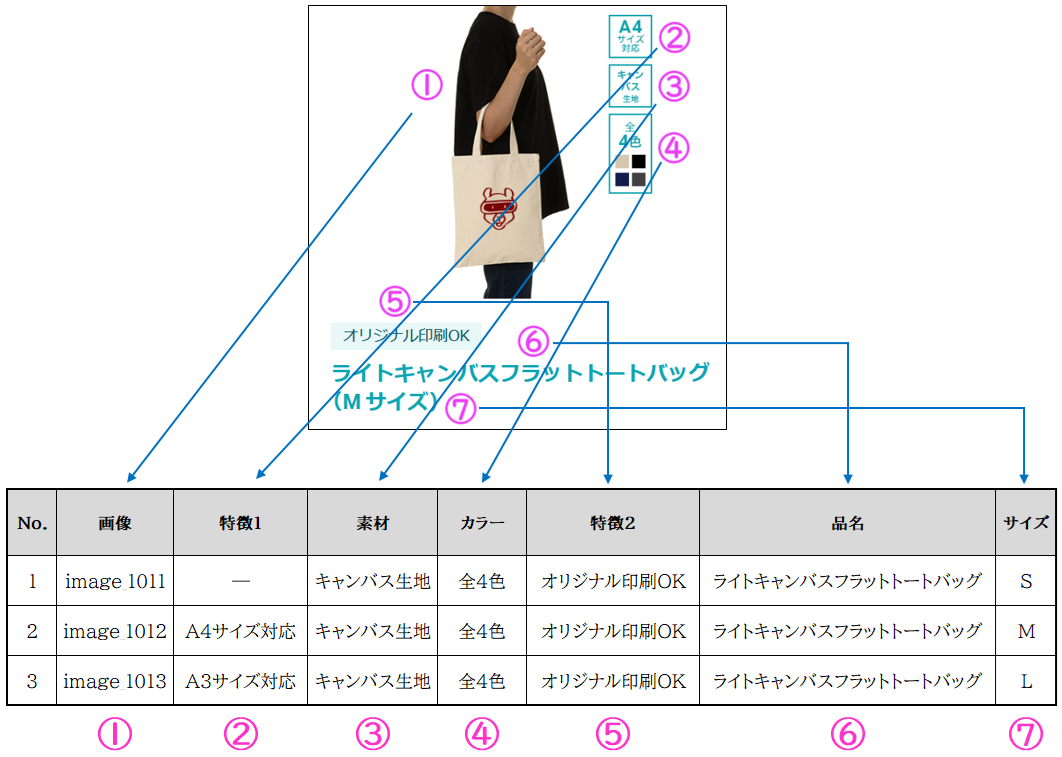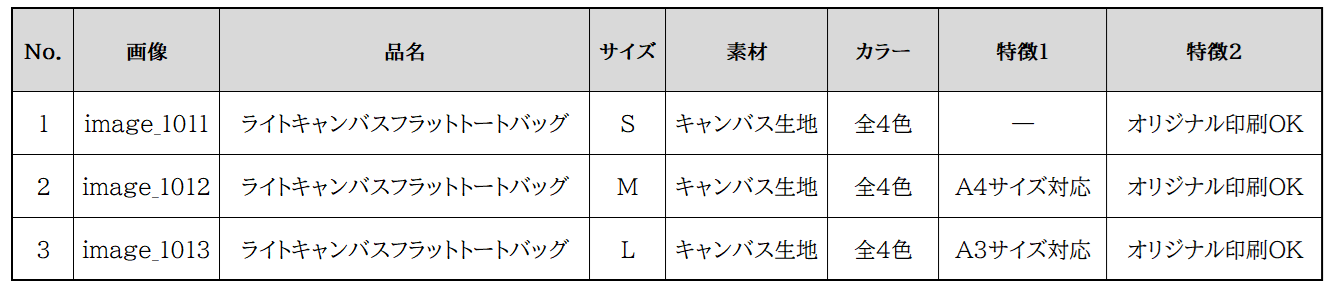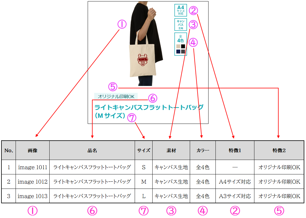 上の画像の情報を確認するエクセル原稿が以下になります。No.2の行が上記の商品画像に対応しています。