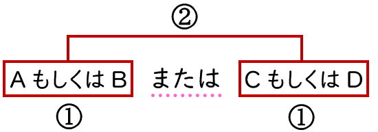1段階目の結び付き(①)には「もしくは」を、2段階目の結び付き(②)には「または」を使います。言い換えると、「もしくは」は小さい選択肢をつなげるときに、「または」は大きい選択肢をつなげるときに使います。