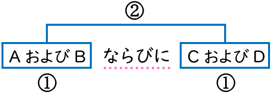 「および」「ならびに」を一つの文で使用する場合、大きいくくりには「ならびに」を、小さいくくりには「および」を使います。