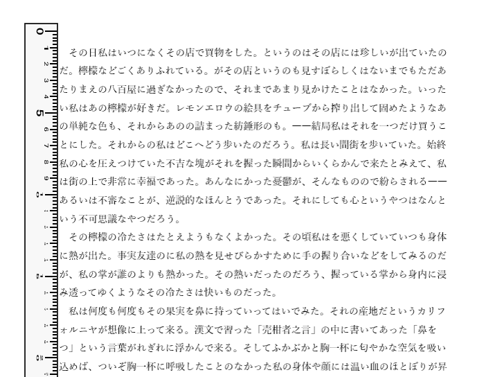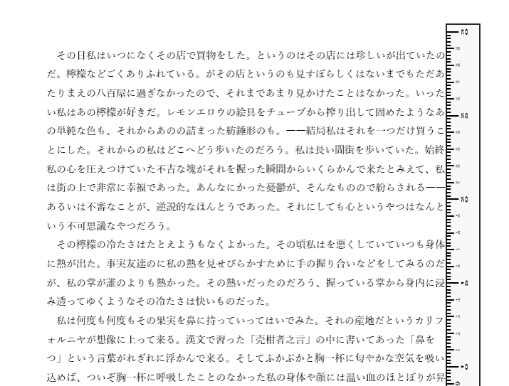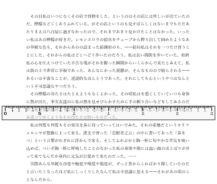 次の文章は物差しを使用していないものです。上の文章と比べれば、物差しがあるとないとでは一行の見やすさが明らかに違うことがわかります。