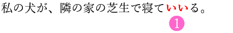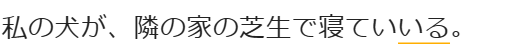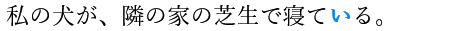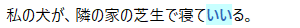 「私の犬が、隣の家の芝生で寝ていいる。」