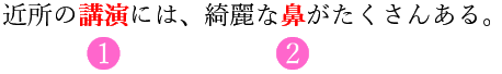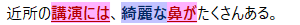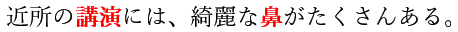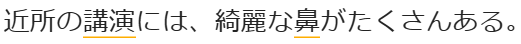 指摘されるべき誤りは、「綺麗な鼻がたくさんある」です。文脈からすると、おそらく「綺麗な女性がたくさんいる」という意味だと思われます。したがって、修正された文は次のようになります。「近所の講演には、綺麗な女性がたくさんいる。」