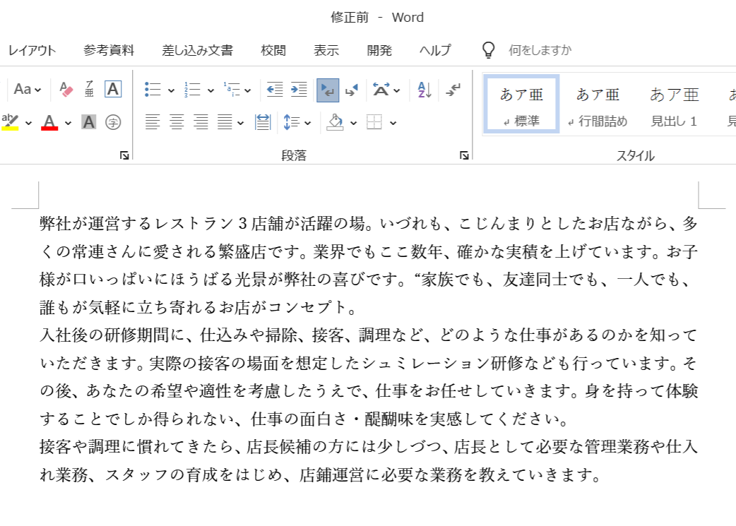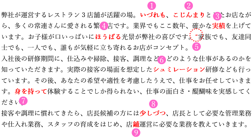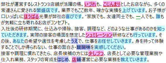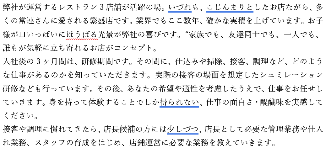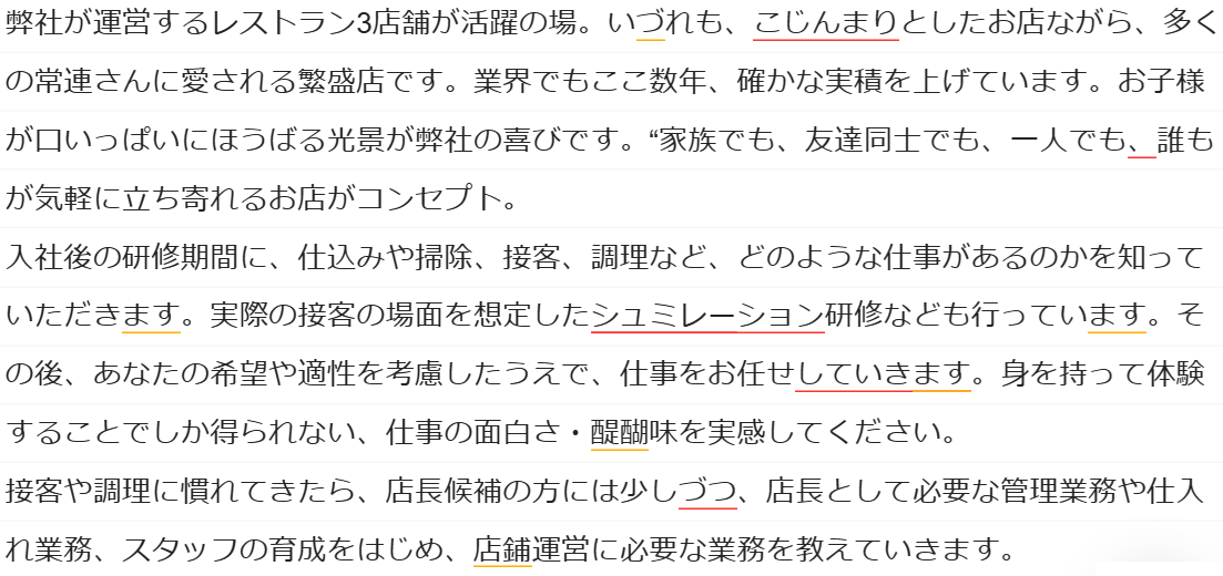 修正後の文章: 「弊社が運営するレストラン3店舗が活躍の場です。いずれも、こじんまりとしたお店ながら、多くの常連さんに愛される繁盛店です。業界でもここ数年、確かな実績を上げています。お子様が口いっぱいにほおばる光景が弊社の喜びです。“家族でも、友達同士でも、一人でも、誰もが気軽に立ち寄れるお店”がコンセプトです。 入社後の研修期間に、仕込みや掃除、接客、調理など、どのような仕事があるのかを知っていただきます。実際の接客の場面を想定したシミュレーション研修なども行っています。その後、あなたの希望や適性を考慮したうえで、仕事をお任せしていきます。身をもって体験することでしか得られない、仕事の面白さ・醍醐味を実感してください。 接客や調理に慣れてきたら、店長候補の方には少しずつ、店長として必要な管理業務や仕入れ業務、スタッフの育成をはじめ、店舗運営に必要な業務を教えていきます。」