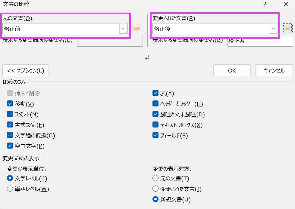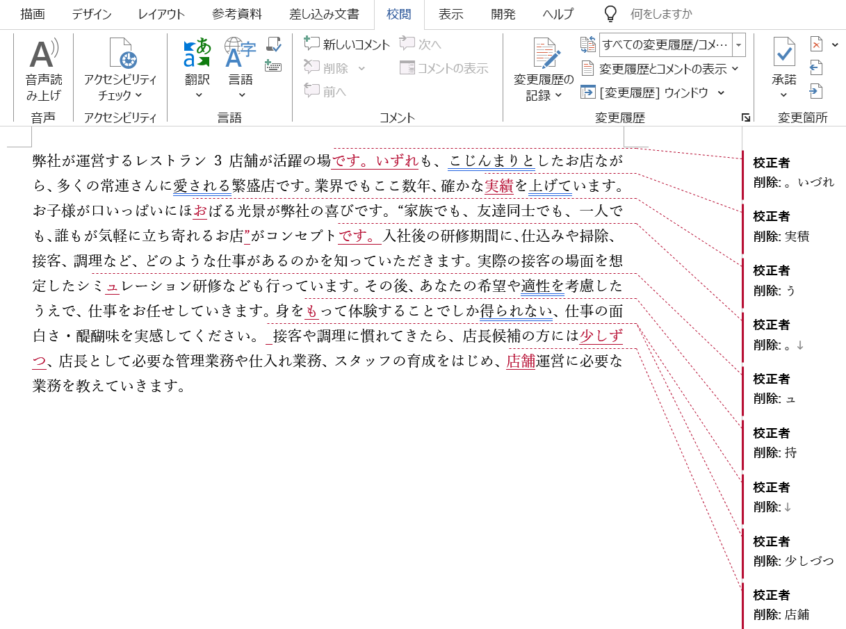 【参考記事】>Wordで文章校正:文章比較のやり方解説[ピンポイントで間違いを見つける]