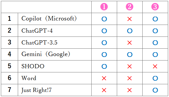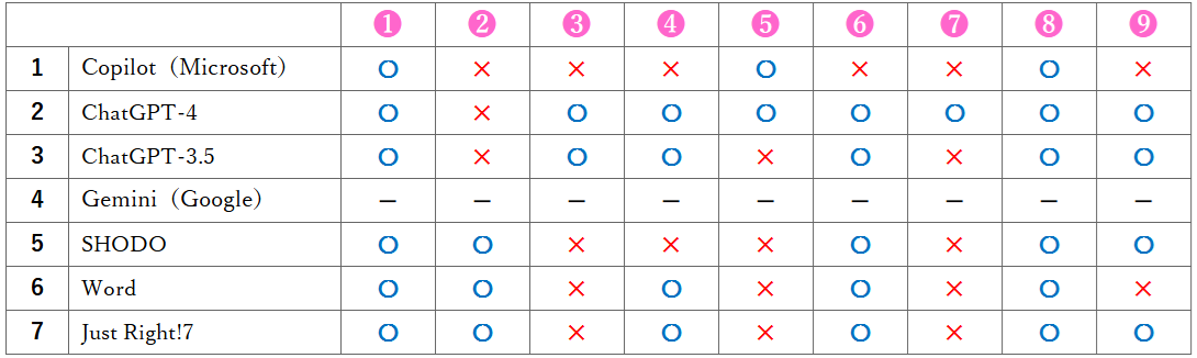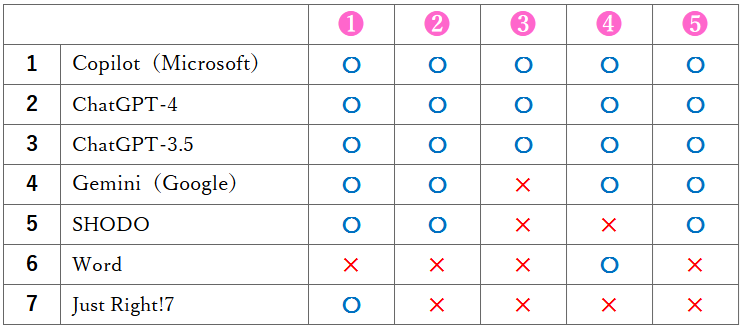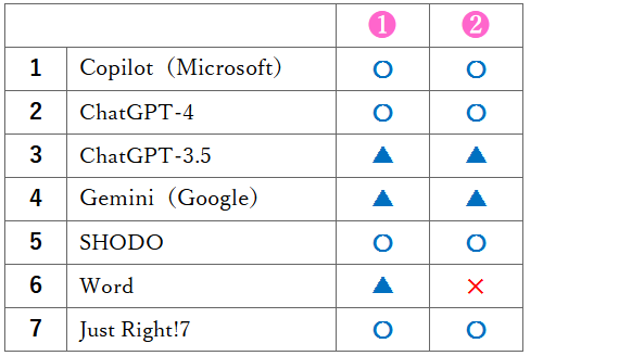 3のChatGPT-3.5と、4のGeminiは、誤りを個別に指摘しているのではなく、文章自体がおかしいという返答のため「▲(0.5点換算)」にしています。