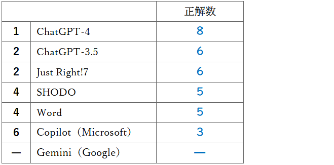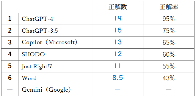 Geminiは、<問題文5>を考慮して採点から除外しましたが、<問題文2>ではChatGPT-4とGeminiだけが全問正解しています。高い精度が見込めるものであることは確かです。