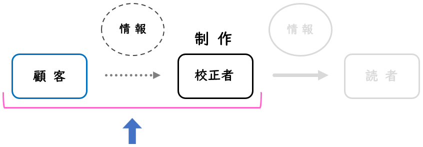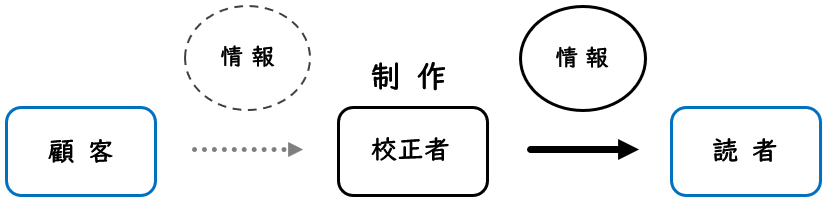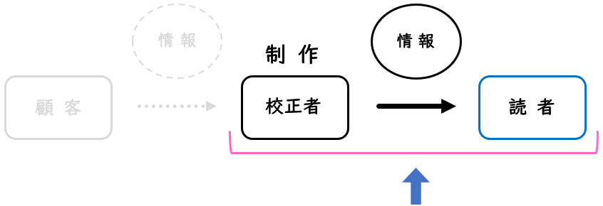 以下説明するにあたって、校正以外の職種まで含めると複雑になるので、シンプルに「顧客(クライアント、依頼者)」と「校正者」と「読者」の3つに絞って見ていきたいと思います。